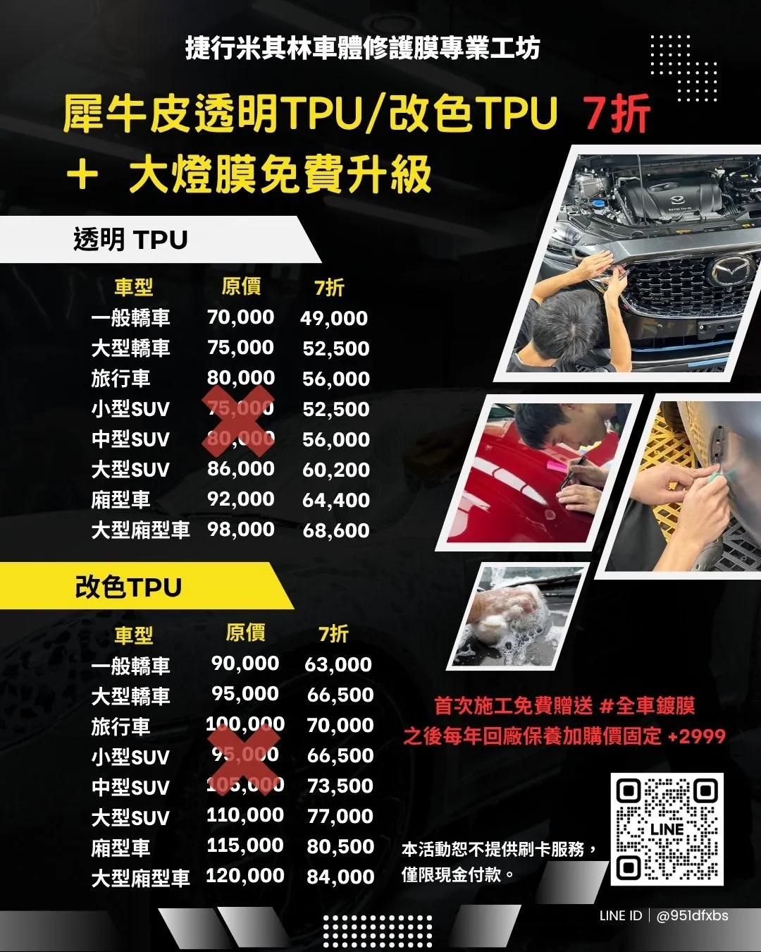 針對追求極致品質與長效保固的車主,提供米其林精品等級犀牛皮包膜優惠。